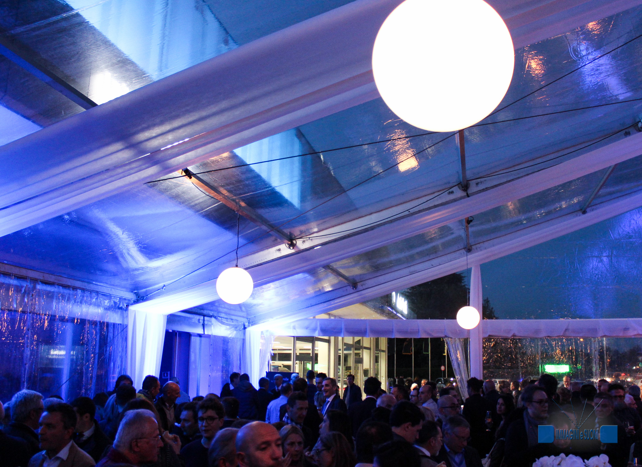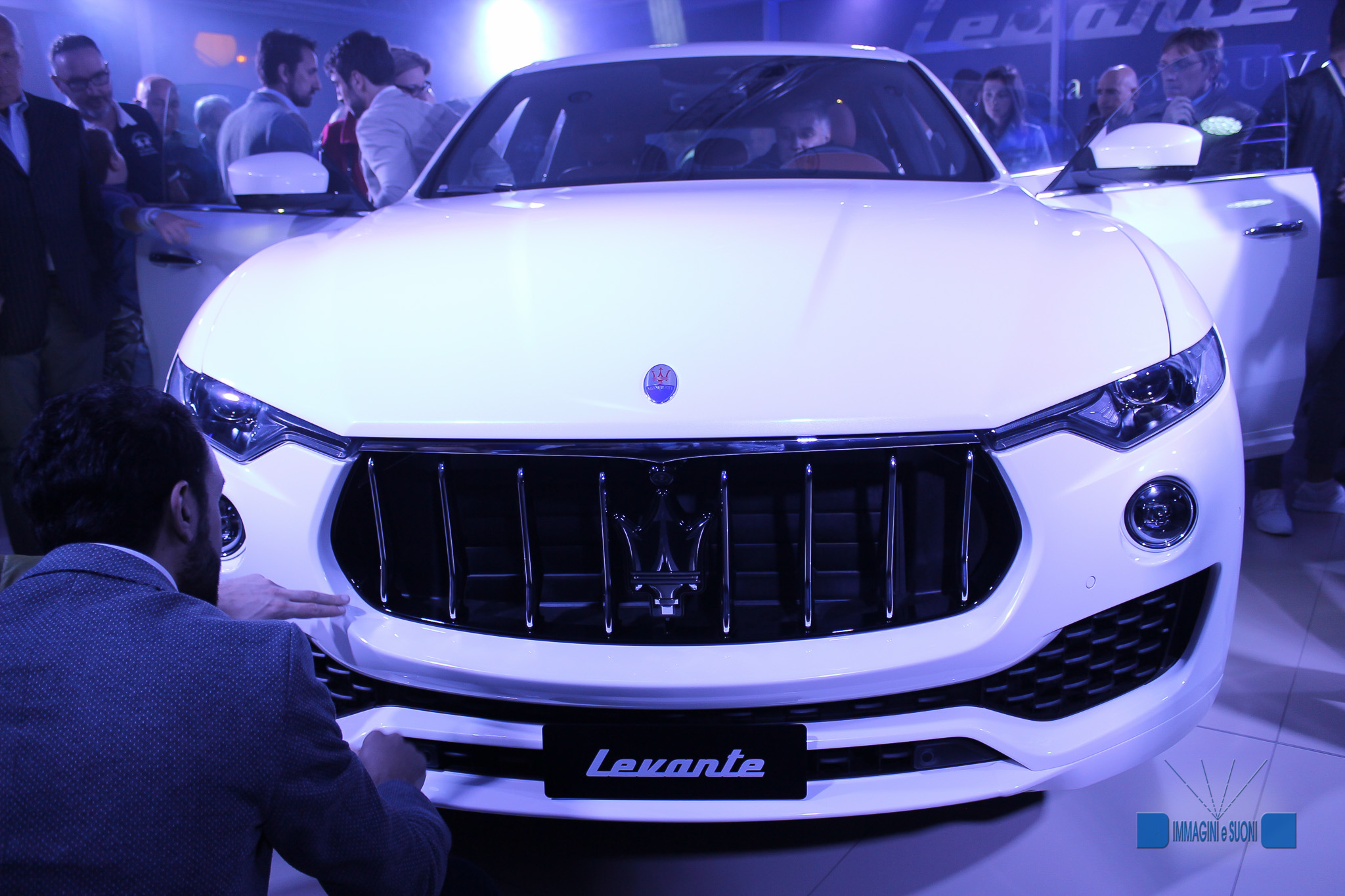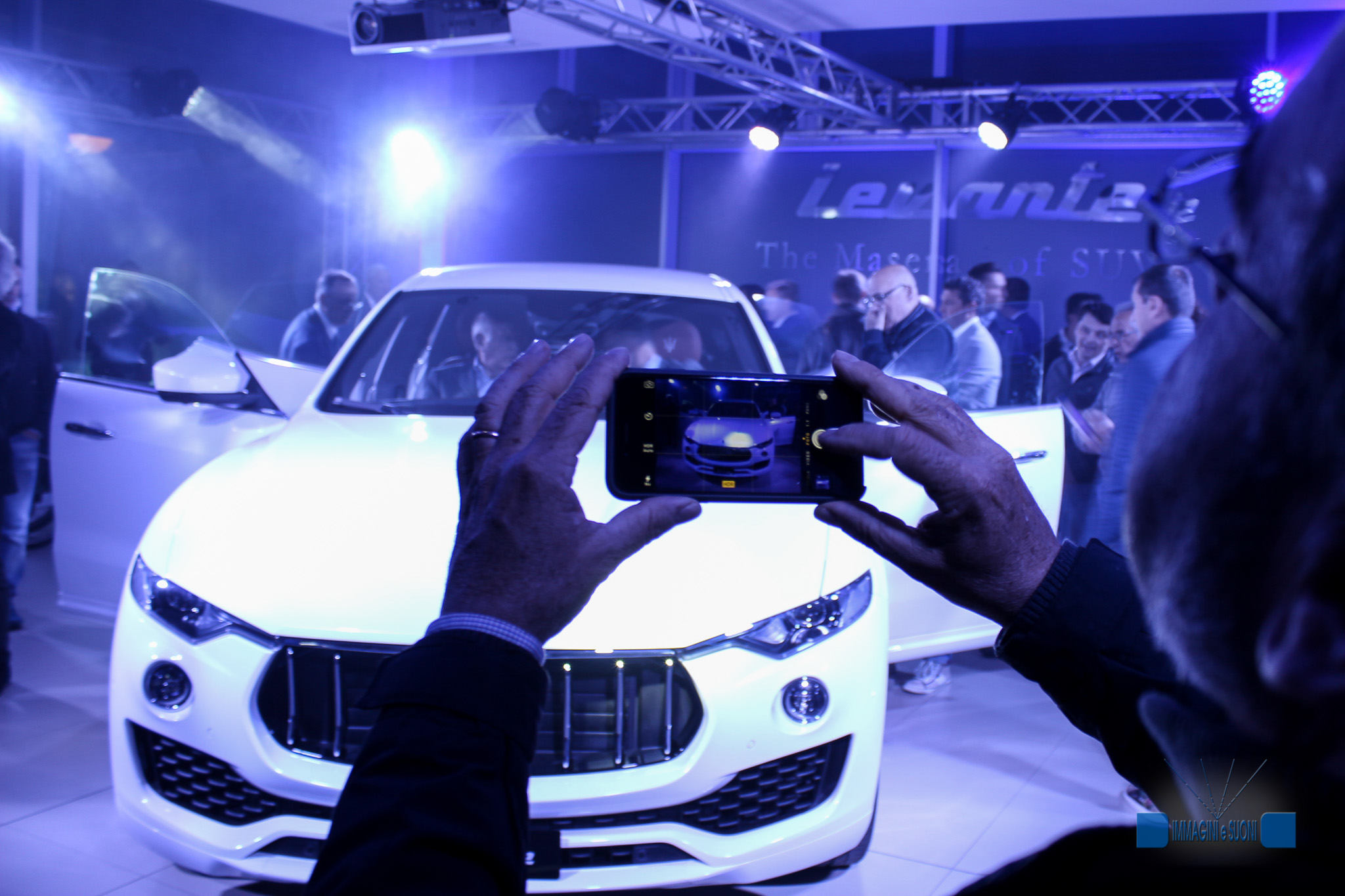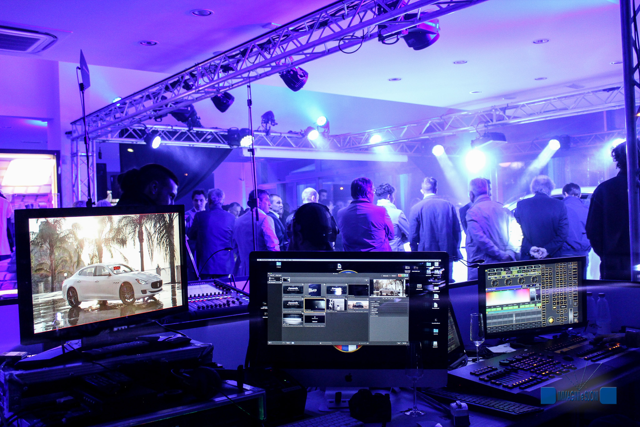 An evening with passionate guests for the presentation of the new Maserati Levante. Lighting with standard headlights and motorized LED lights on the stage truss, two video projections and remote broadcasting of the video of the moment of the launch on a 103″ and a 55″ monitors located inside and outside the dealership.