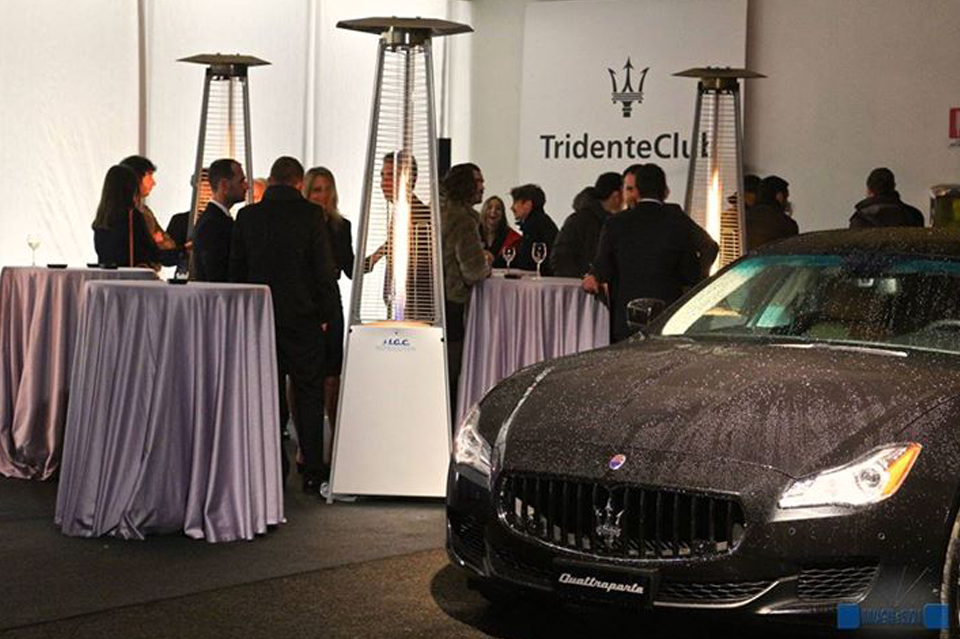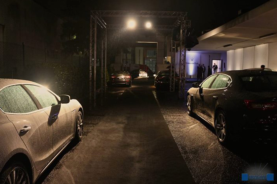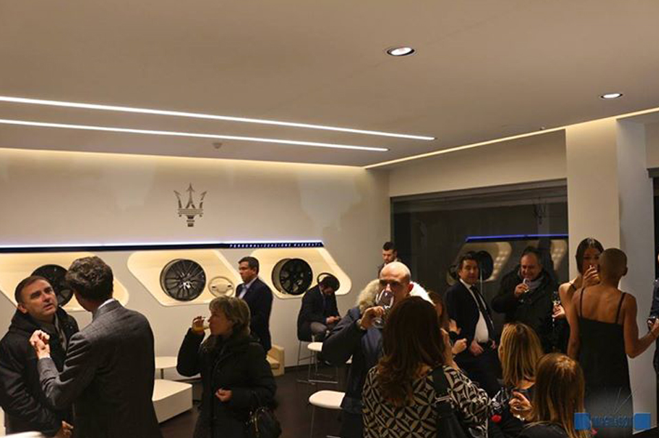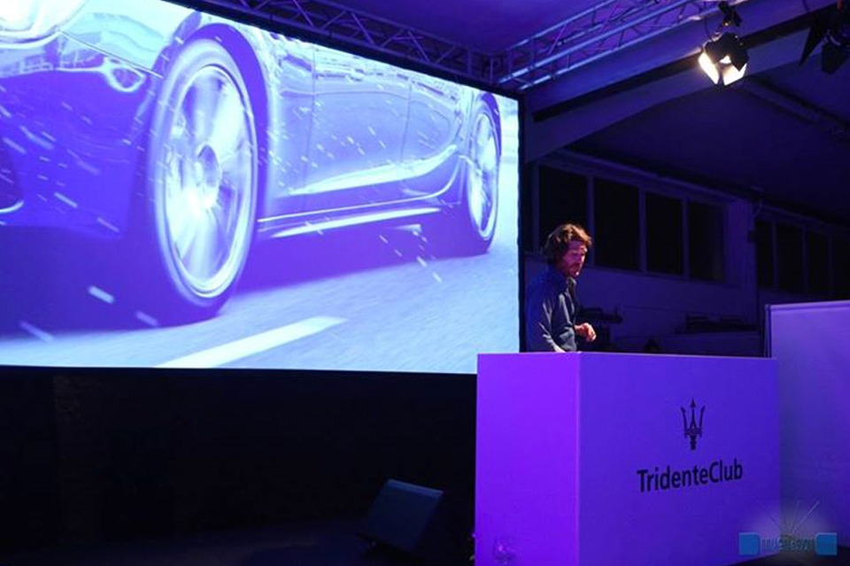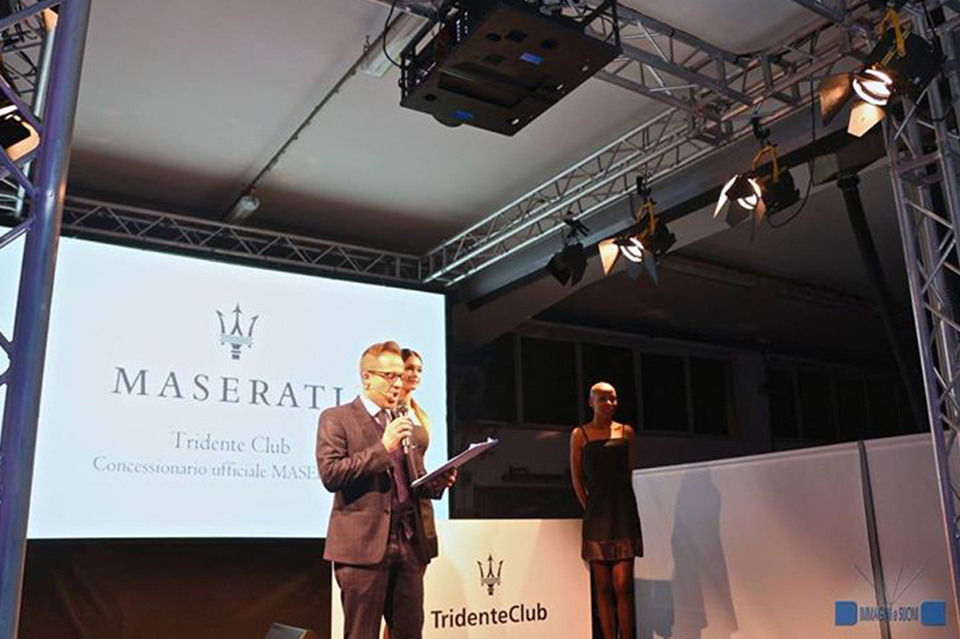Inauguration of the Maserati dealership in Modena. PA audio system, outdoor video projection with emotional visual content, architectural lighting of the building and the cars, marquee for the reception and a particular stage for the DJ set. Elena Santarelli, host of the evening, welcomed mayor of Modena Gian Carlo Muzzarelli.