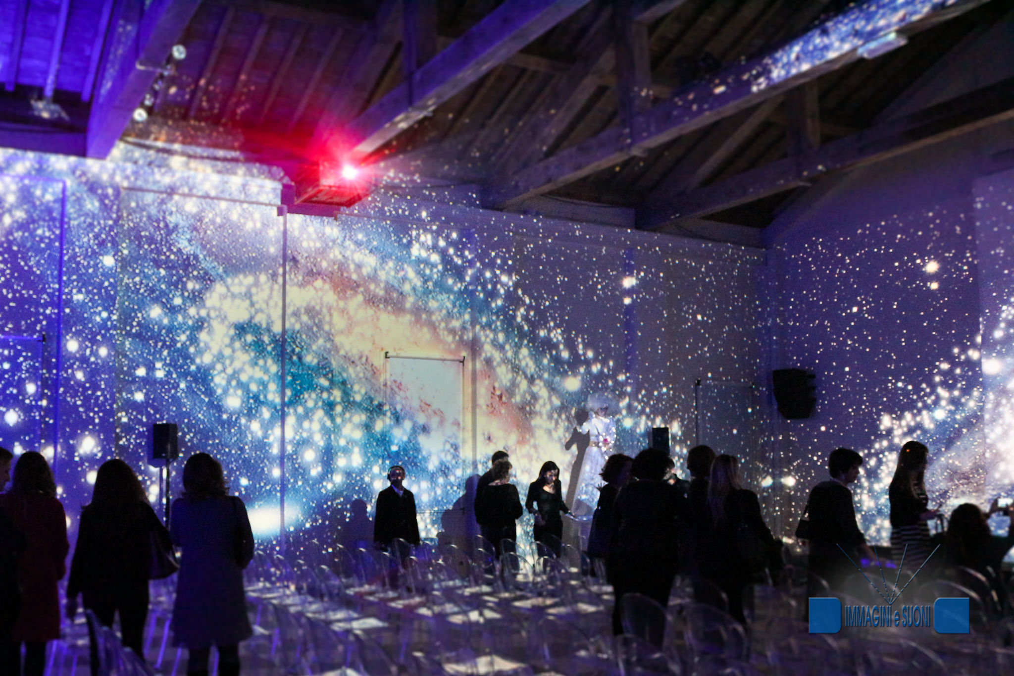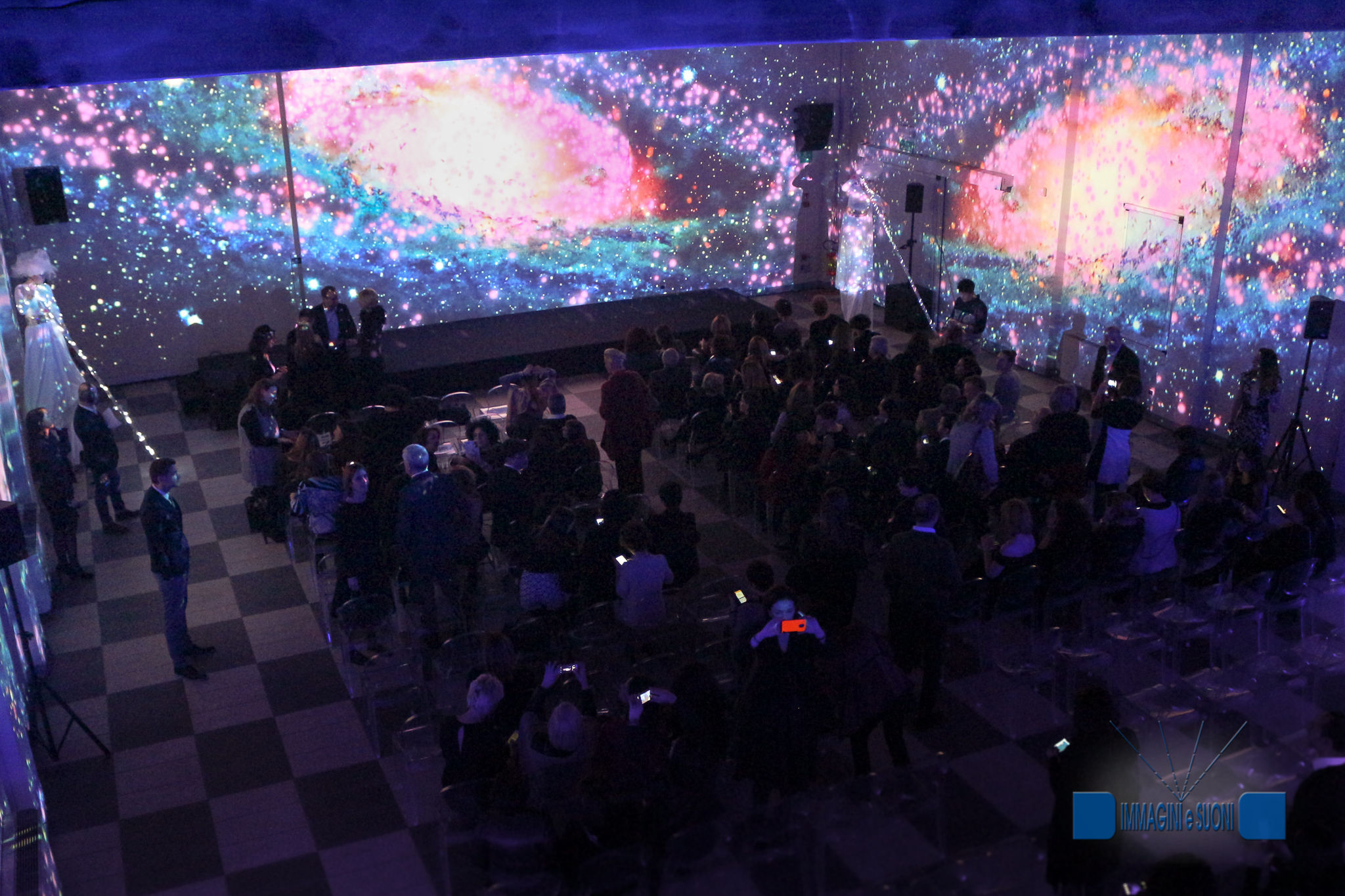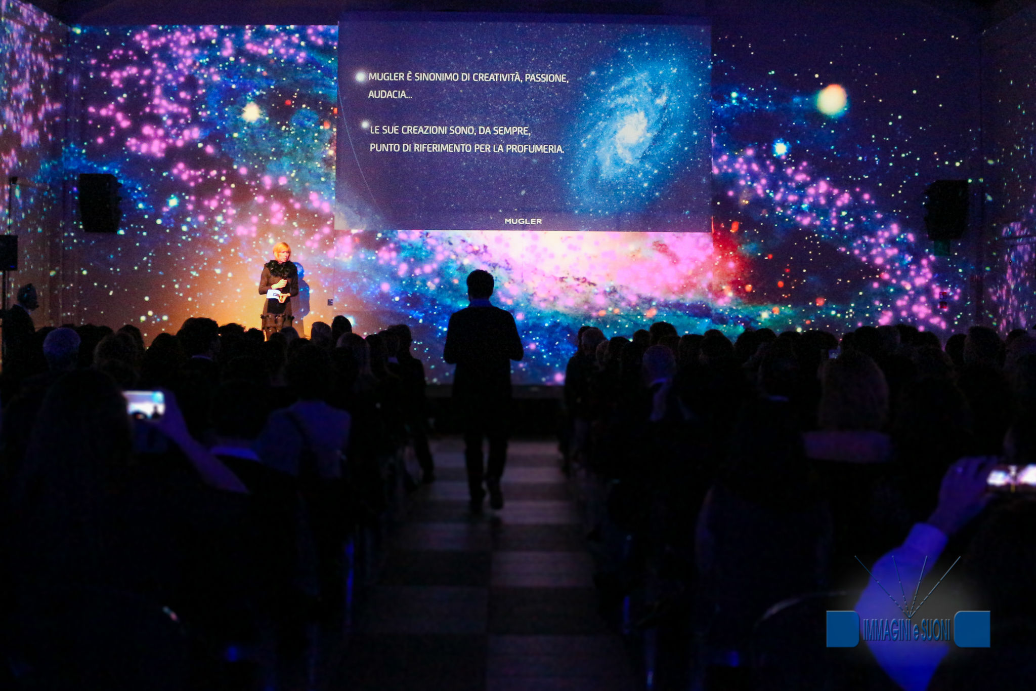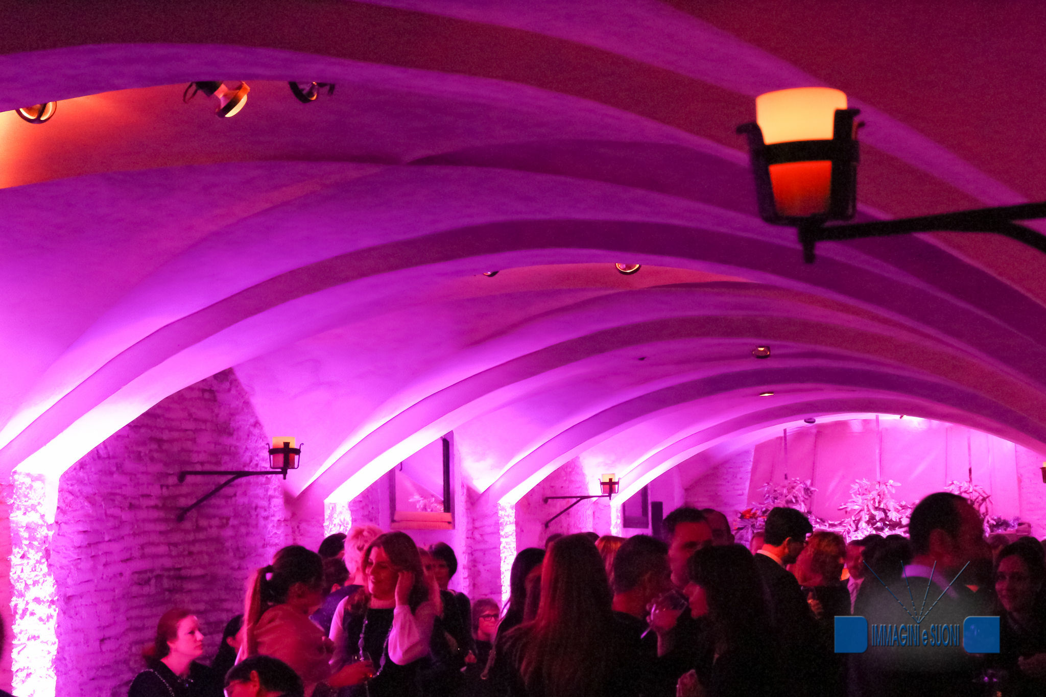 Aperitif in the impressive wine cellars of Bentivoglio Pepoli Palace with architectural lighting in some points; on the second floor presentation of new products with enchanting projection on three sides of the room. The content on the central wall was created with picture-in-picture technique that includes slides and videos on the same screen. Audio diffusion system for a powerful and clear sound. Followed by a gala dinner on the ground floor. Event planning and management by HBComm