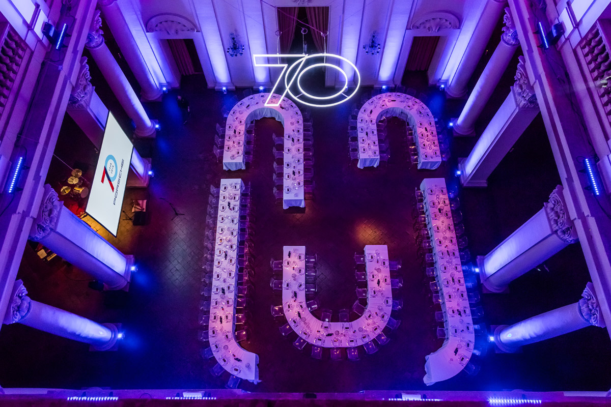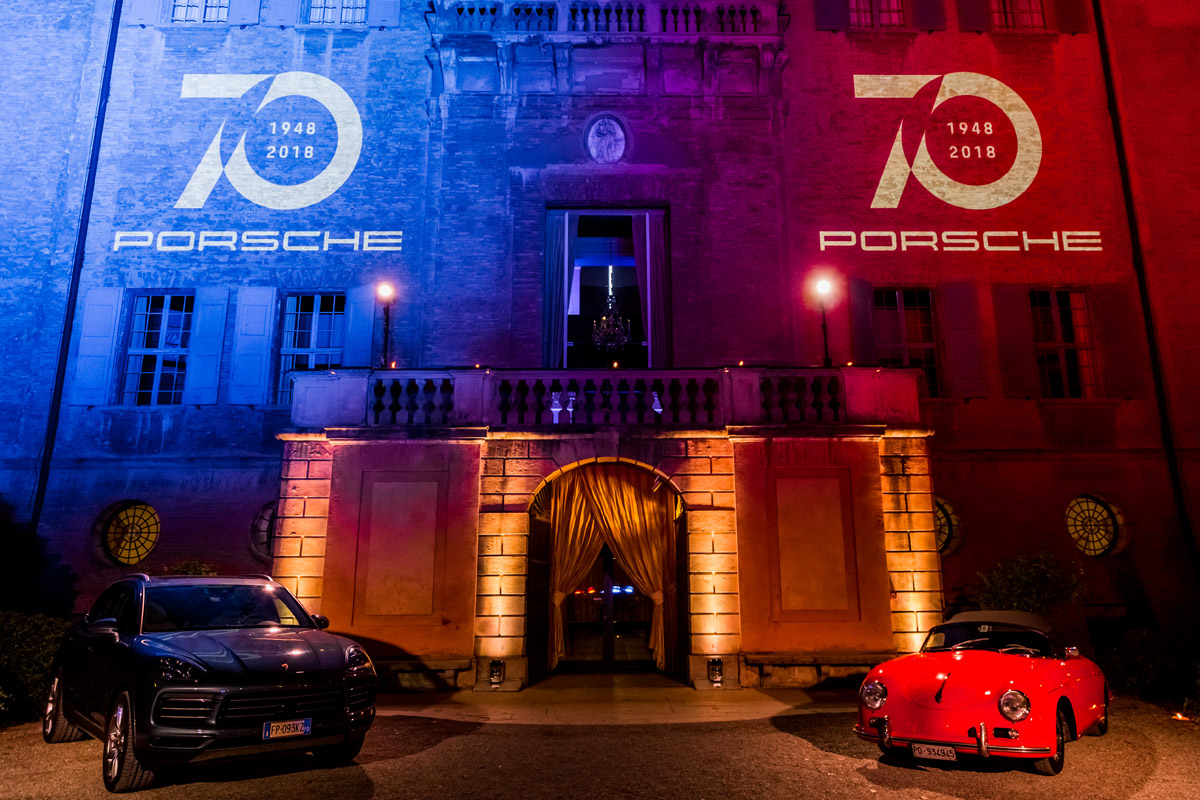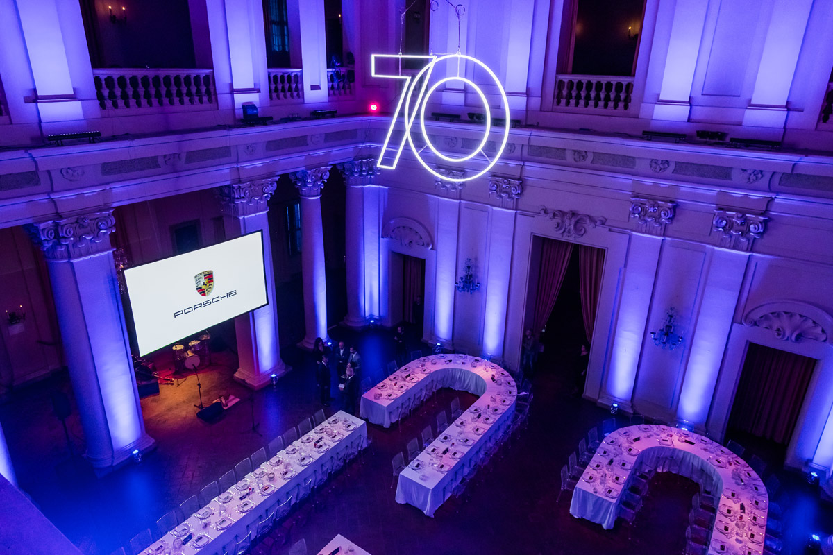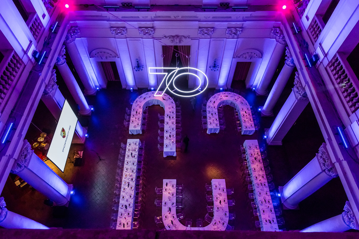 PORSCHE Italia festeggia il suo 70° con una elegante cena di gala a Palazzo Albergati. Atmosfera resa indimenticabile da luci architetturali, videoproiezioni e audio per il concentro, perfettamente amplificato ed ottimizzato per l’acustica del salone.
