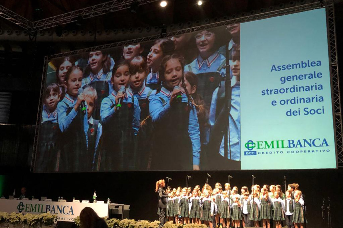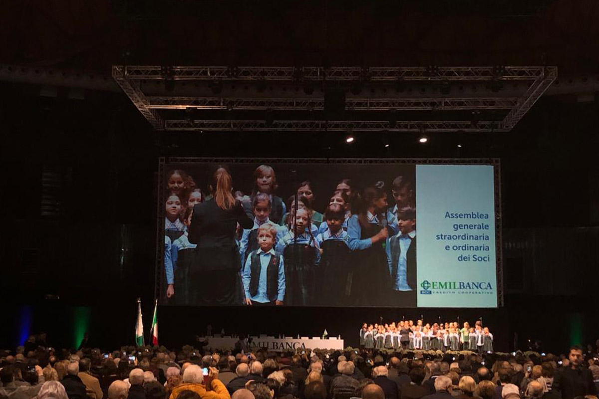 Impianto di diffusione audio – Sistema di illuminazione della sala e del palco con fari motorizzati a led, montati su ring sospeso in traliccio di alluminio.Videoripresa live con regia tricamera radiocollegate e videoproiezione su schermo di 100 mq. con due videoproiettori ad alta luminosità configurati in soft-edge per ottenere un’unica immagine senza segni di sovrapposizione fra le due macchine.