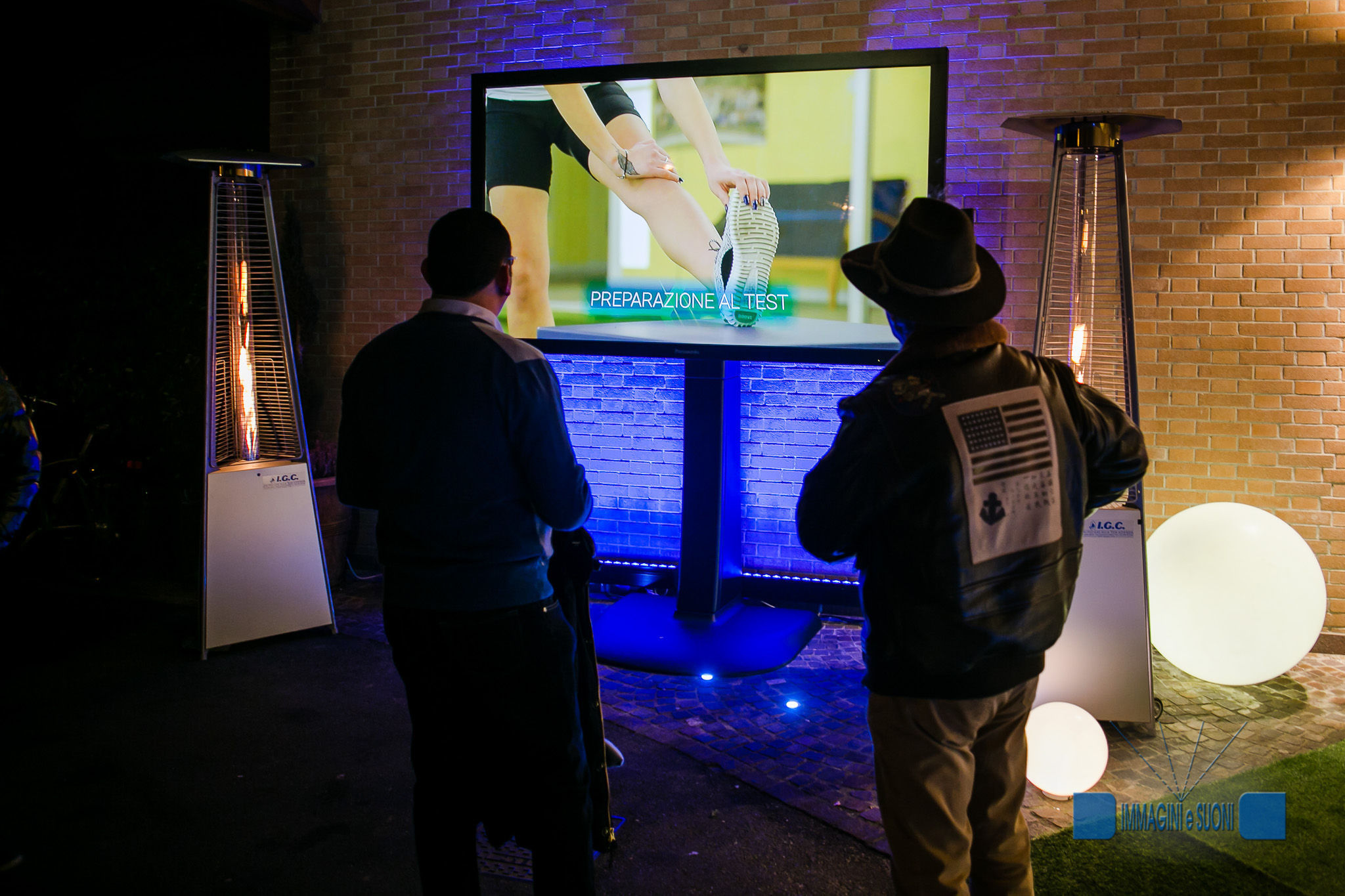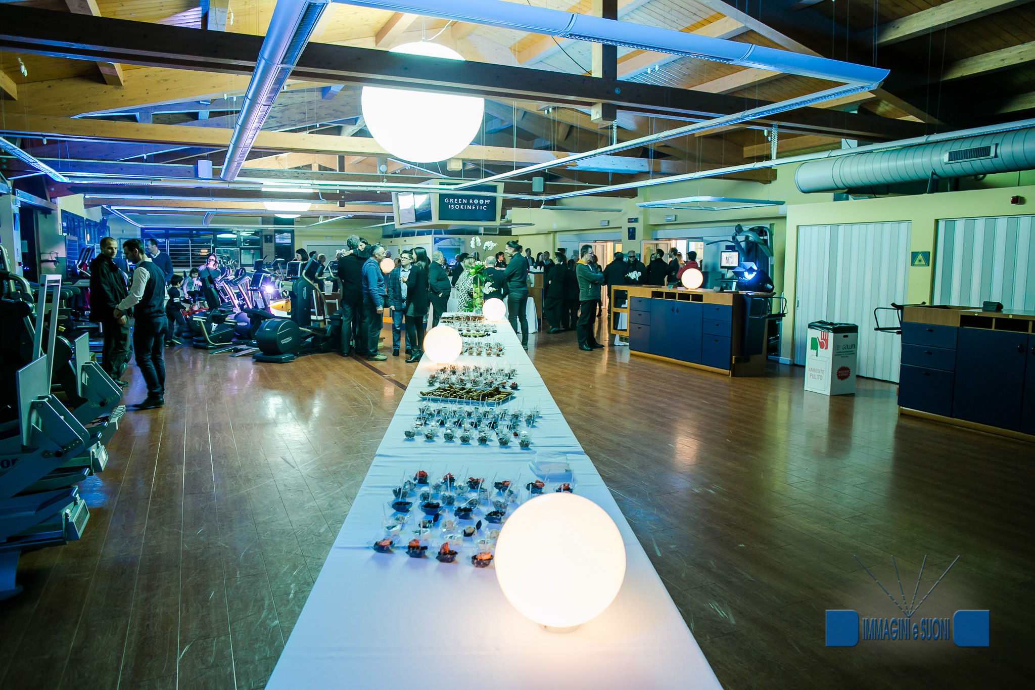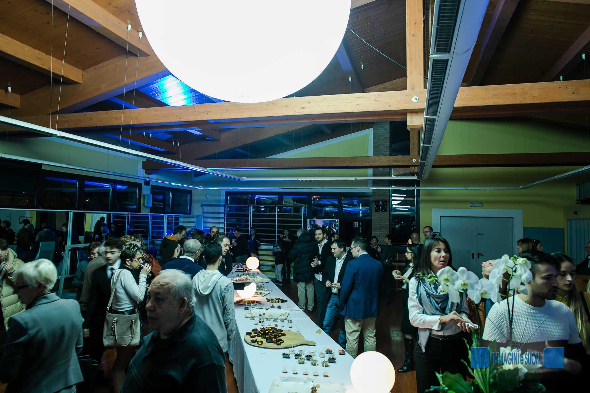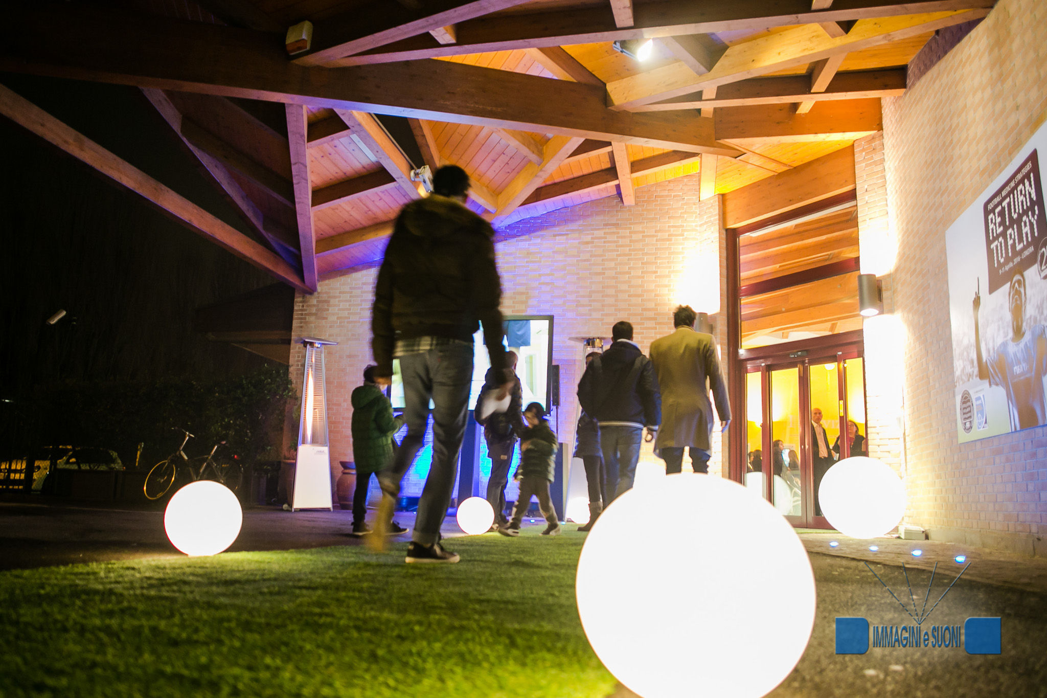 Luci d’atmosfera nel ingresso della struttura e architetturali nella palestra dove si è stato allestito il buffet. Passerella di sfere luminose e monitor 103 pollici adiacenti all’entrata. Amplificazione audio di sottofondo.