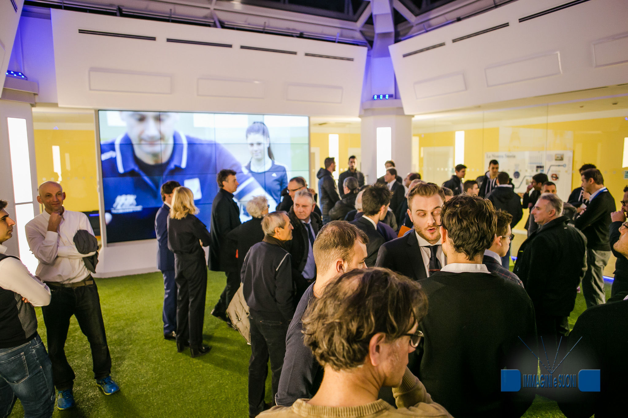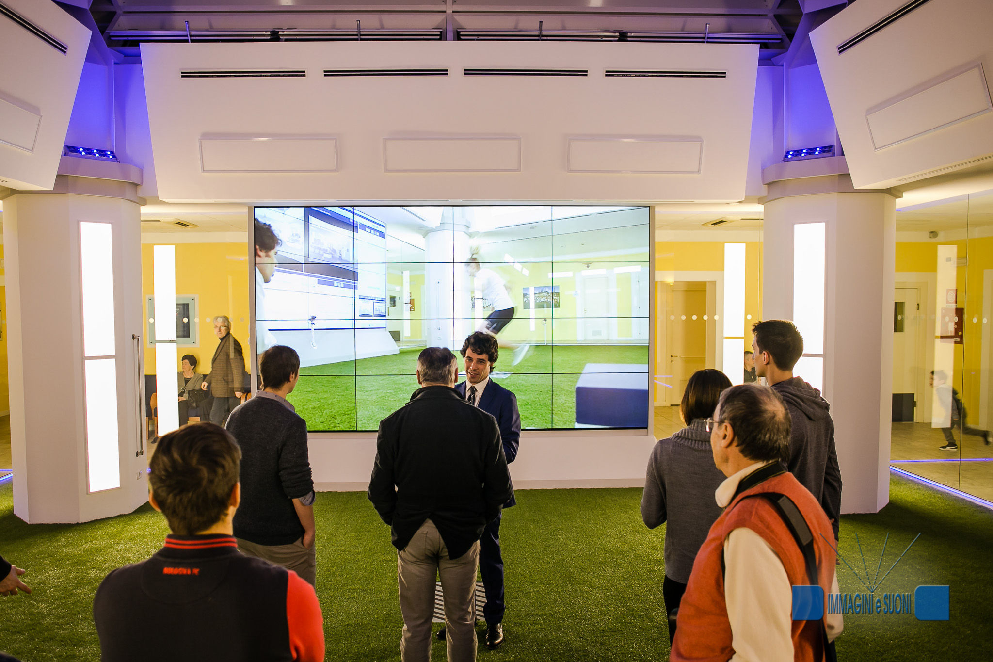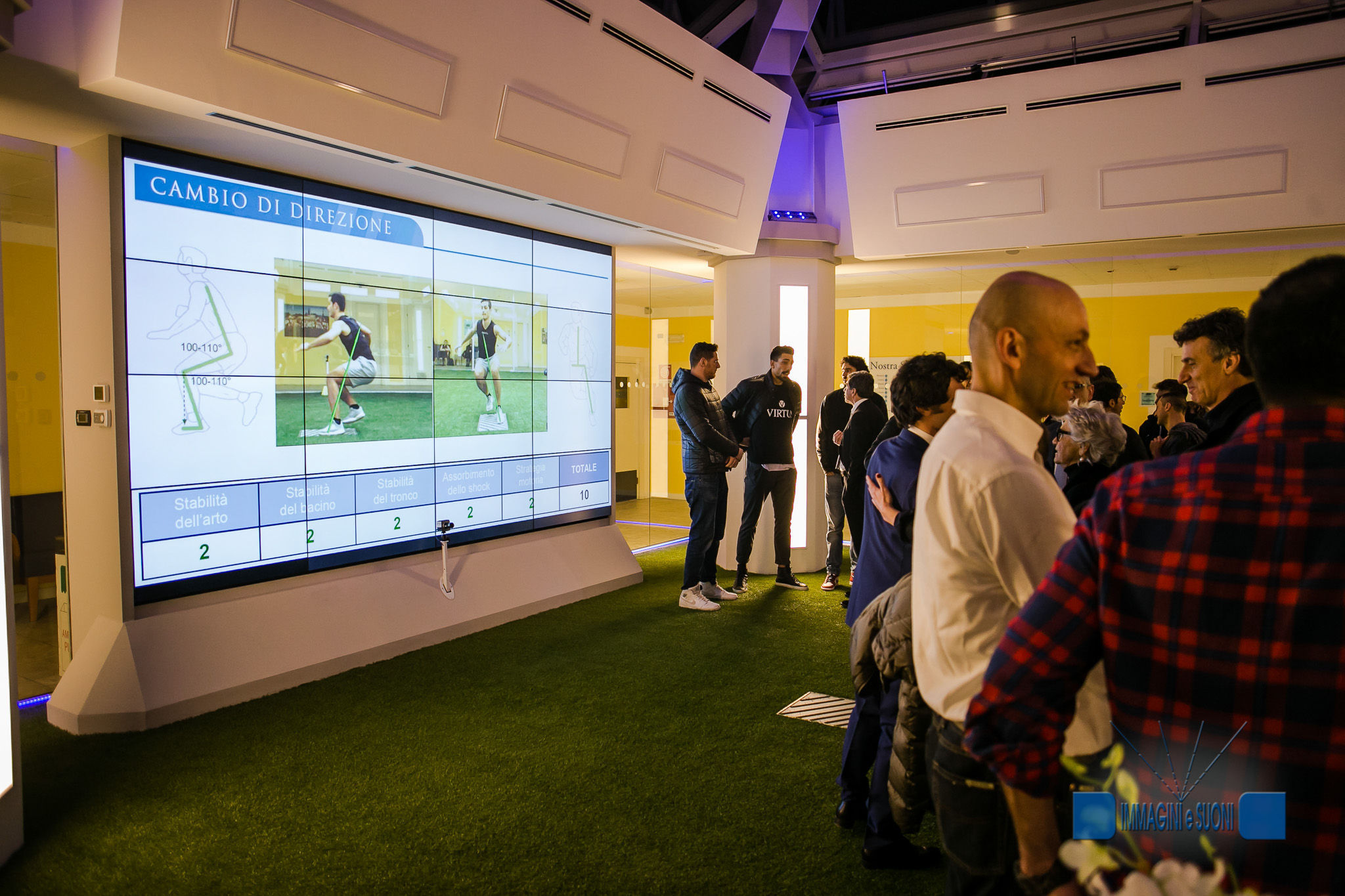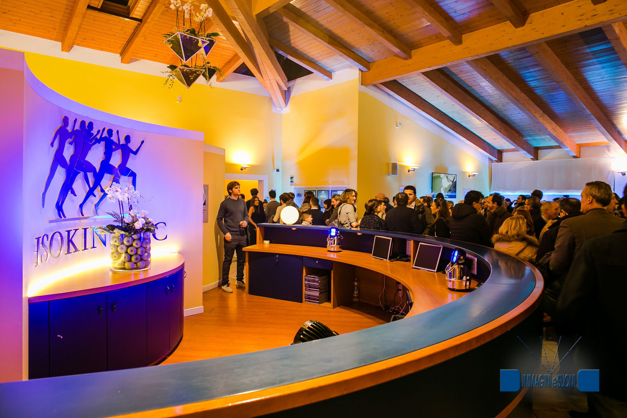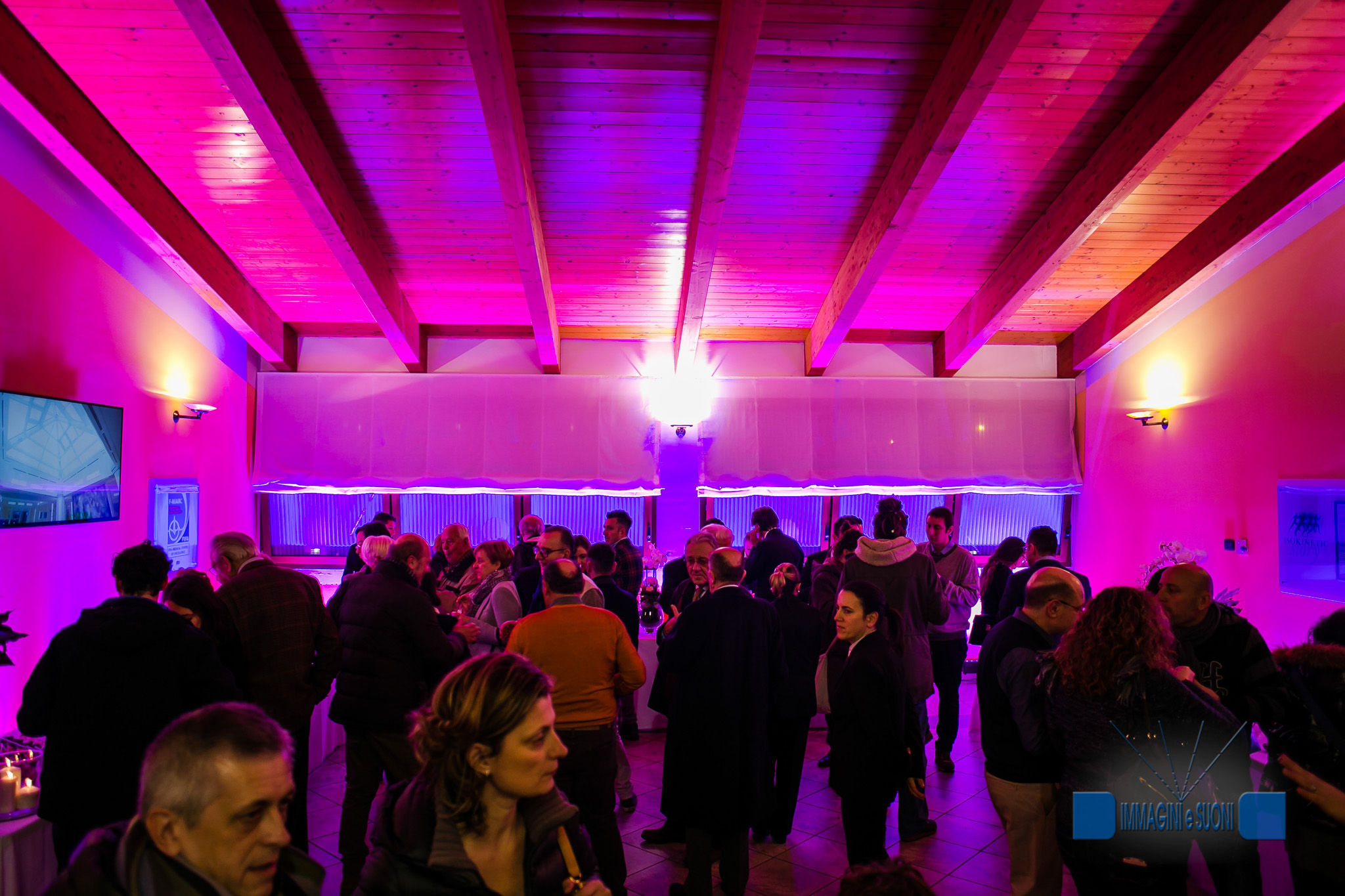 Luci d’atmosfera nel ingresso della struttura e architetturali nella palestra dove si è stato allestito il buffet. Passerella di sfere luminose e monitor 103 pollici adiacenti all’entrata. Amplificazione audio di sottofondo.