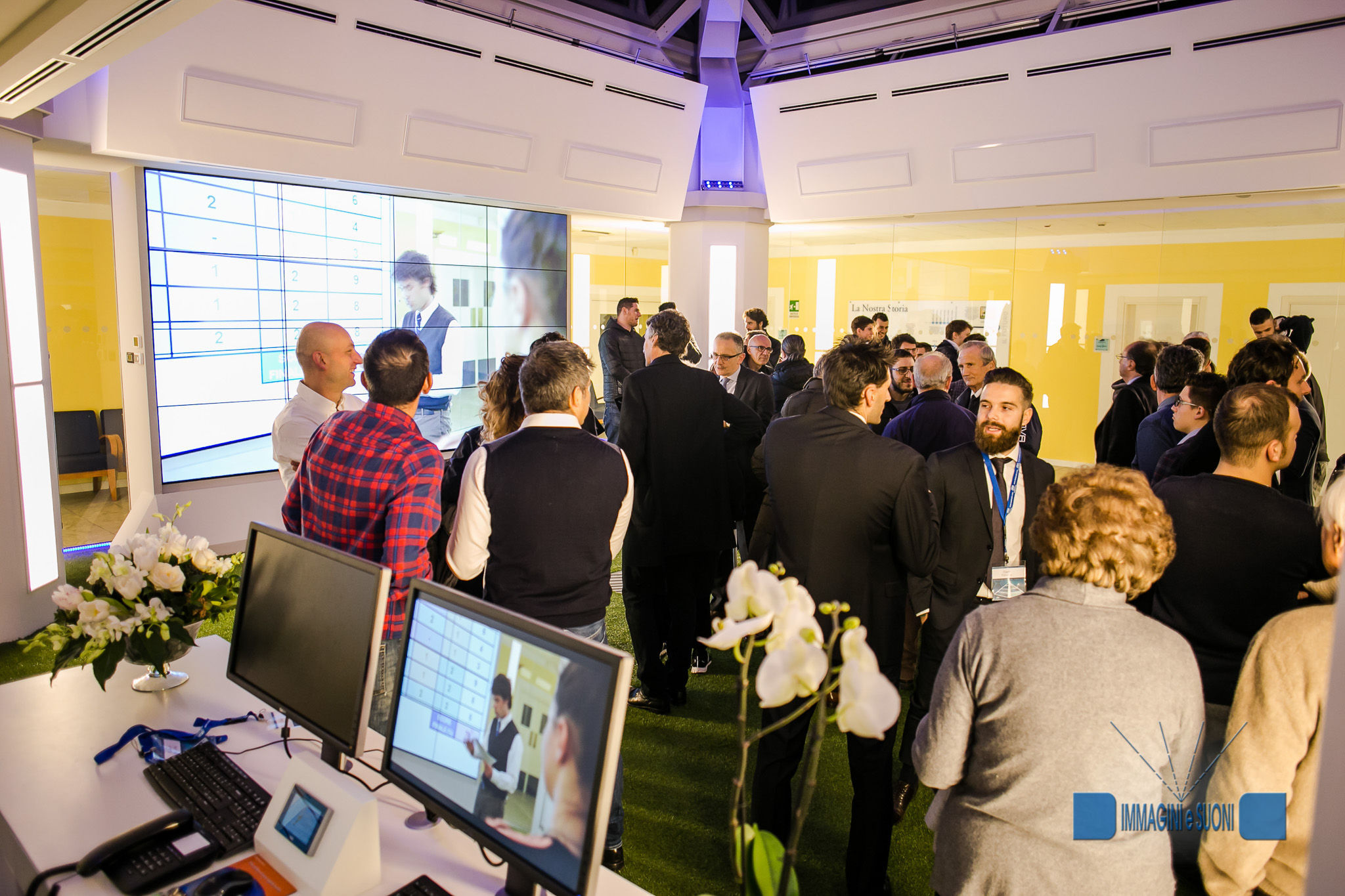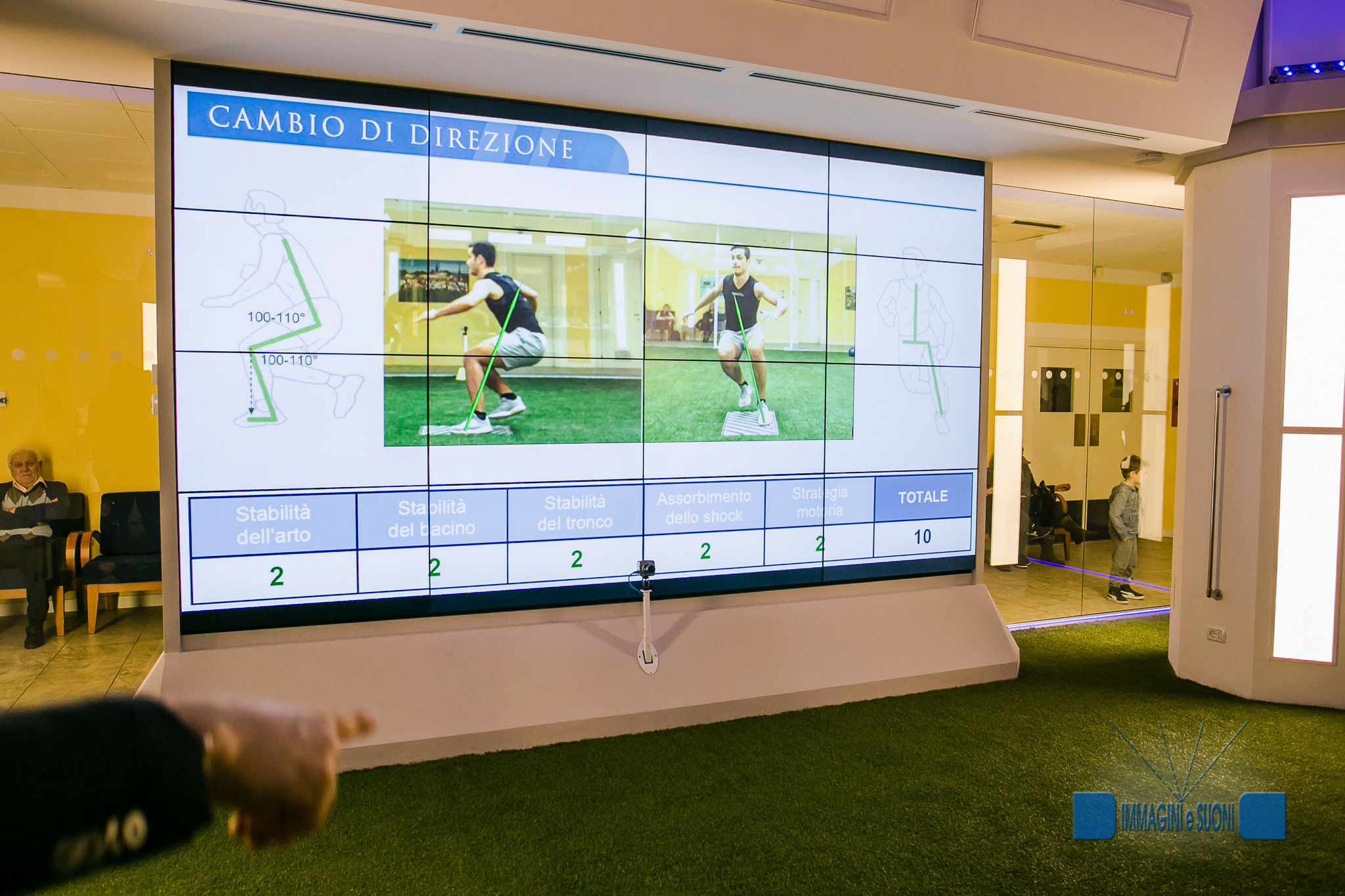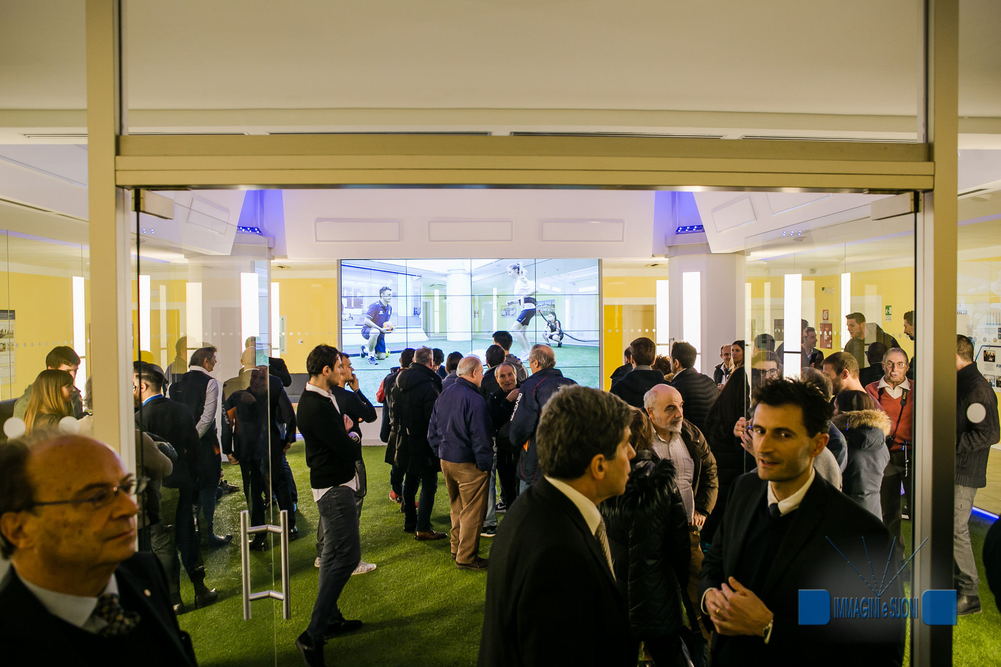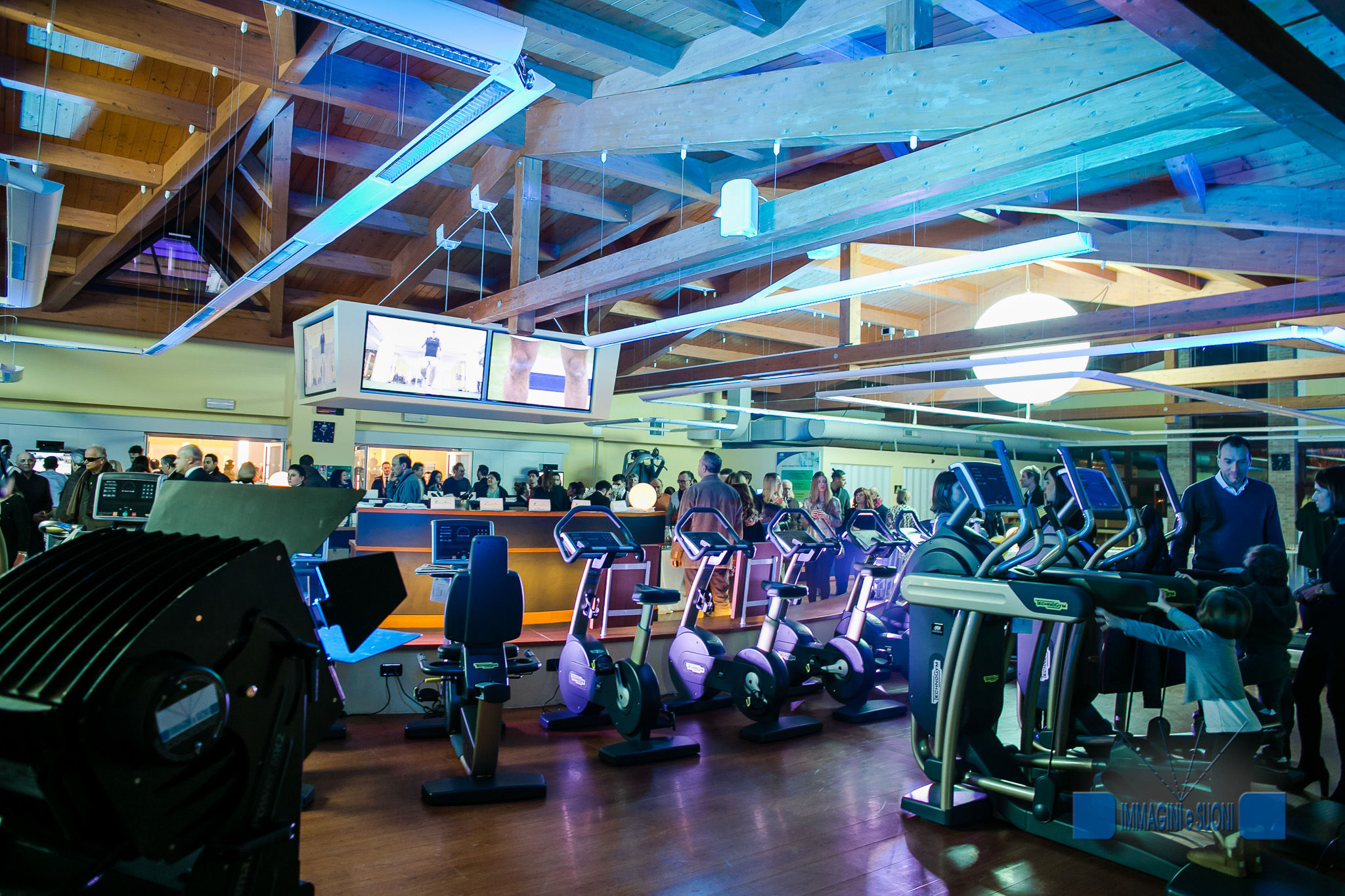 Luci d’atmosfera nel ingresso della struttura e architetturali nella palestra dove si è stato allestito il buffet. Passerella di sfere luminose e monitor 103 pollici adiacenti all’entrata. Amplificazione audio di sottofondo.